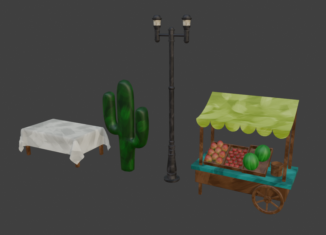 Because of the game’s simplified visual style, many of these props are also reusable. This allows spaces to feel filled out without players realizing the same assets are being repeated throughout the environment. Smaller details such as flowers, fruit, and pots help break up repetition and add visual interest. These assets still maintain unique silhouettes and color choices, helping them stand out and remain recognizable. In many cases, brighter colors play an important role in separating objects within a space.