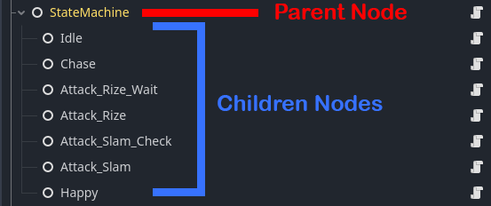 A Finite State Machine is set up with a parentnode whosescript that’s designated as the State Machine, and a virtual class called State. The virtual class State contains a signal called “finished” to be used when a state finishes. It also contains a function called “exit” that is used to clean up, and an “enter” function that is used to enter a state. The State Machine script contains a function that transitions to the next state when the state emits a signal. Since this is node-based, once ready, we loop through the child nodes, connecting each finished signal to the function. The function transitions by exiting the state, getting the path to the new state, and entering that specific state.